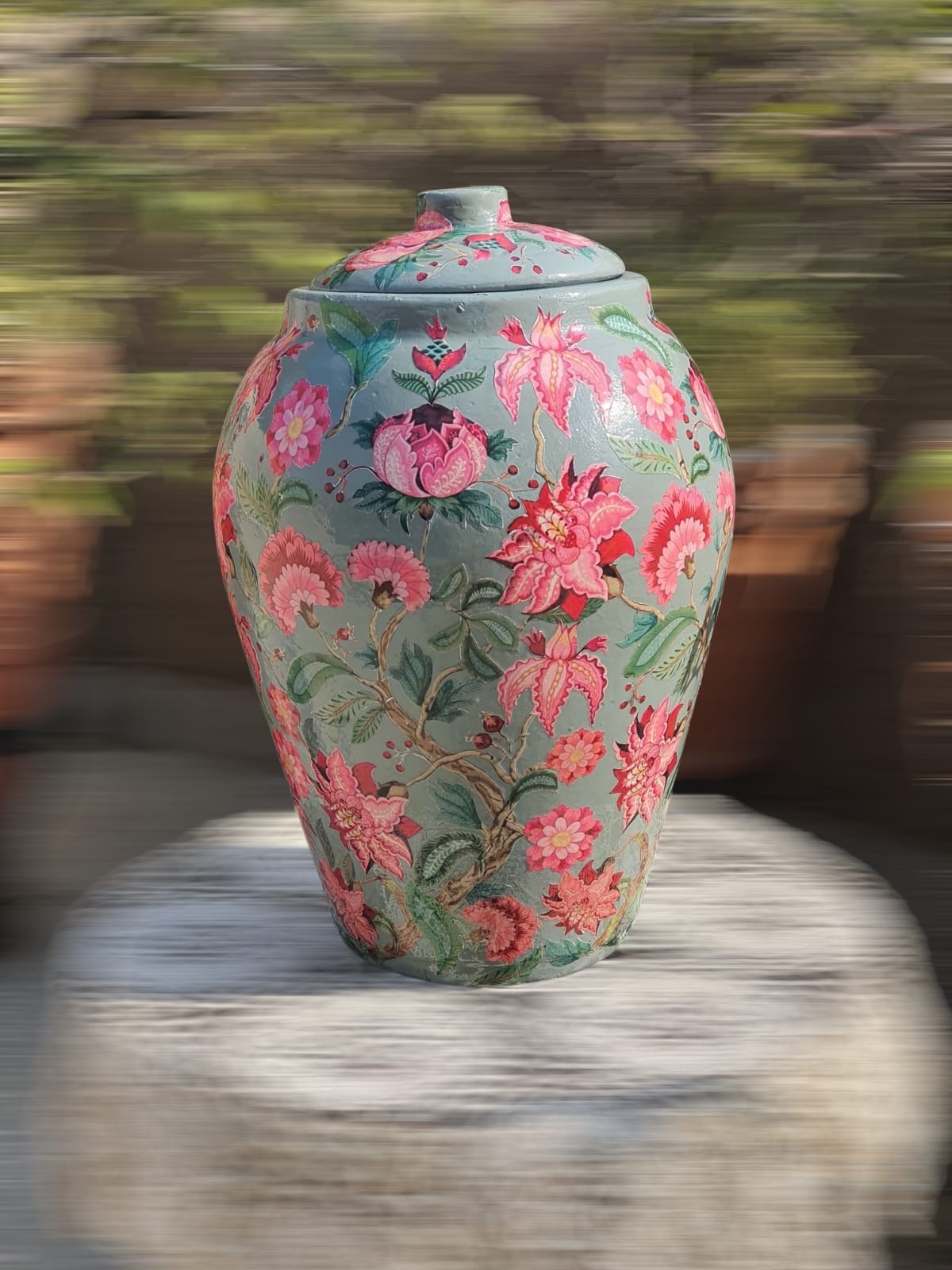 Perfect as a luxury decorative jar with lid, handcrafted statement vase, or artistic centerpiece for living rooms and entryways, this piece brings sophistication and warmth to curated spaces. Whether styled on a console, displayed in a garden room, or paired with elegant décor accents, it instantly enhances the ambiance with heritage charm.