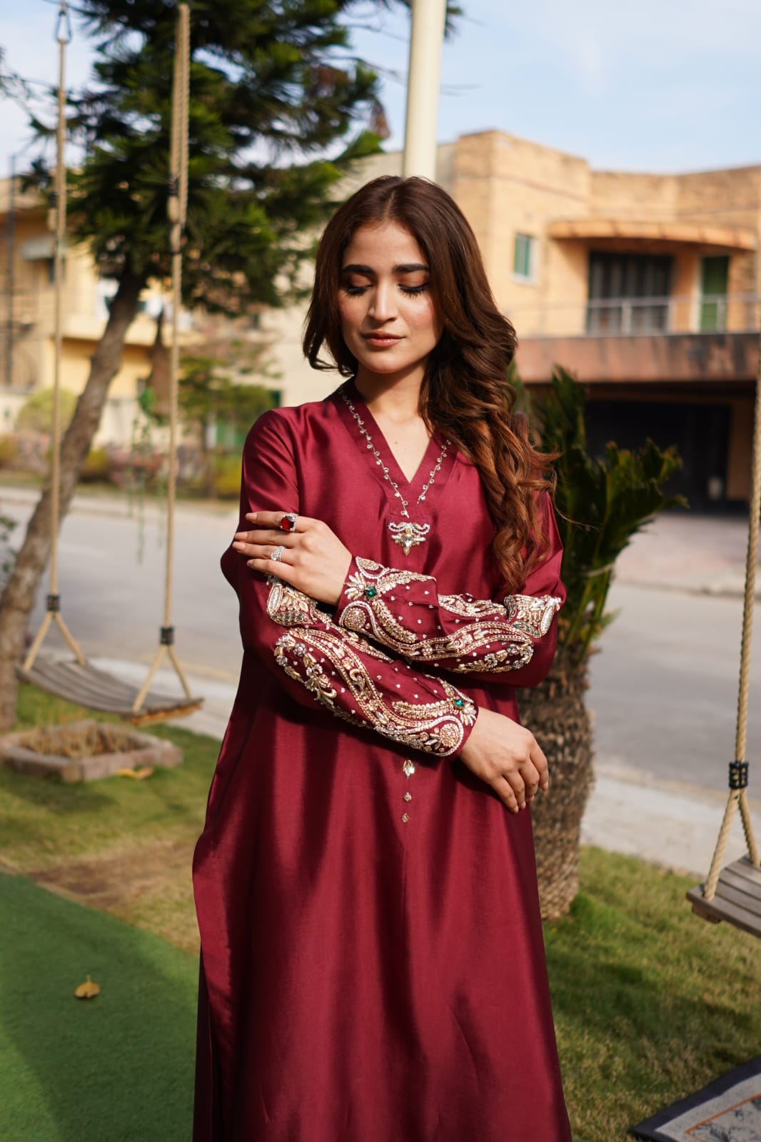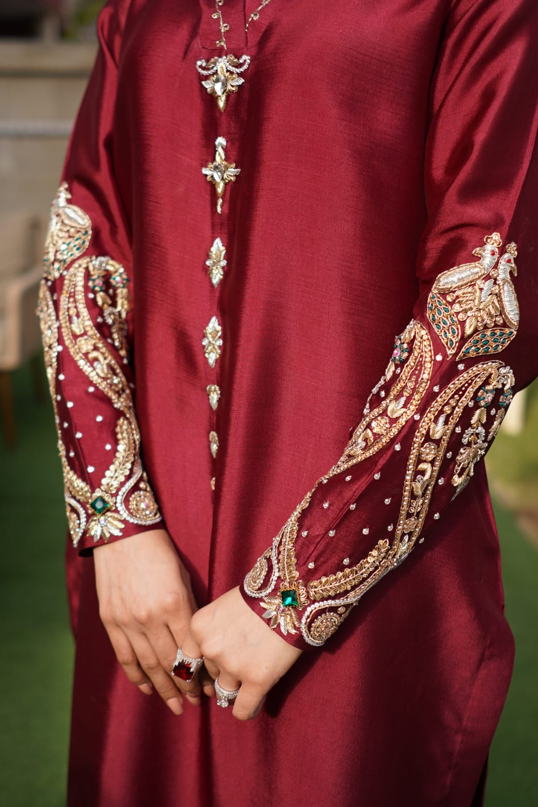 The rich deep maroon hue reflects classic luxury, while the meticulously crafted hand-embroidered sleeve detailing adds a regal touch. Intricate embellishments featuring delicate beadwork and fine embroidery enhance the beauty of the sleeves, creating a statement piece that blends traditional artistry with modern sophistication.