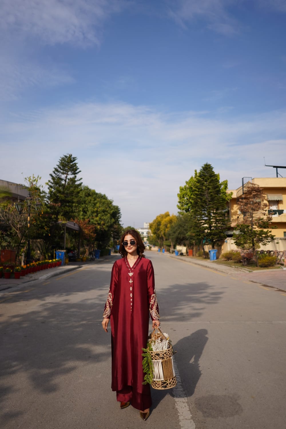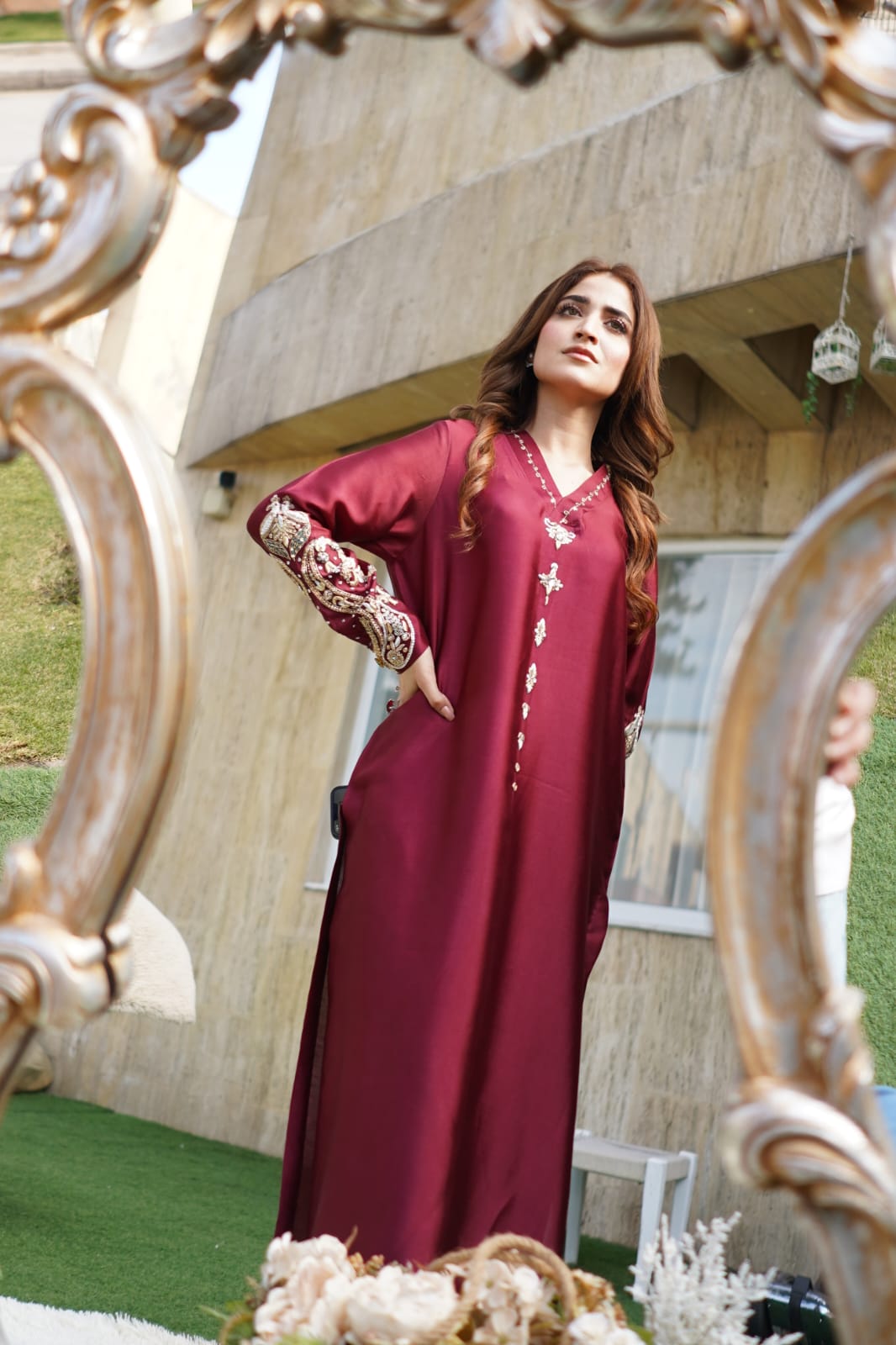- Shirt: Sheer organza with delicate lace and embroidery, blending traditional Pakistani detailing with Dubai’s cosmopolitan flair.