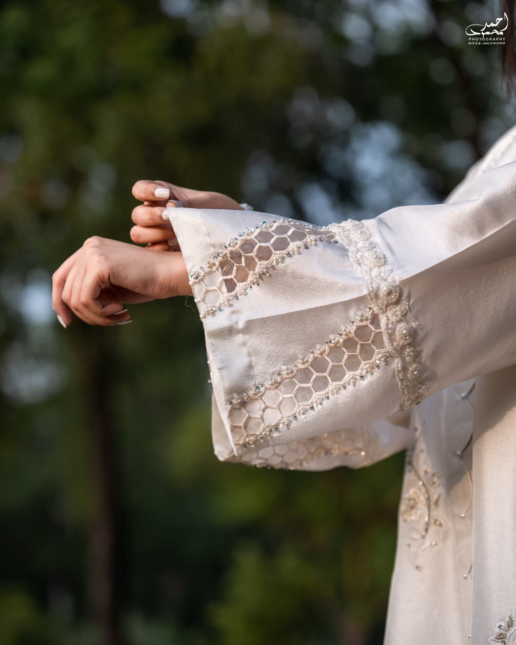 Rendered on a beautiful pearl white silk merged with channelled net, LAYLA features a beautiful cut layered with intricately hand worked embellishments, making it a piece of art.