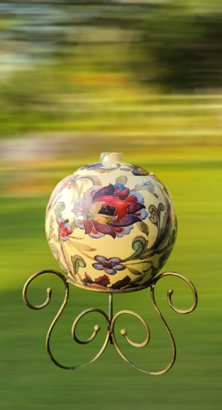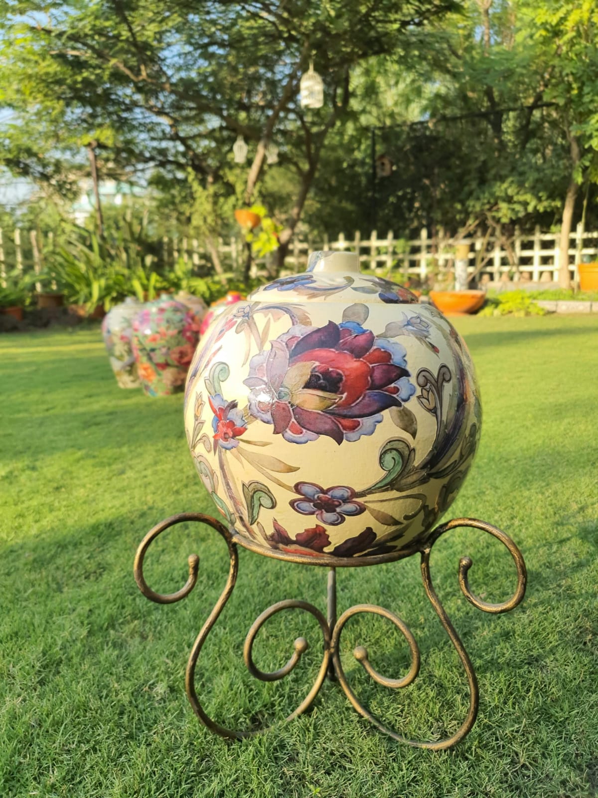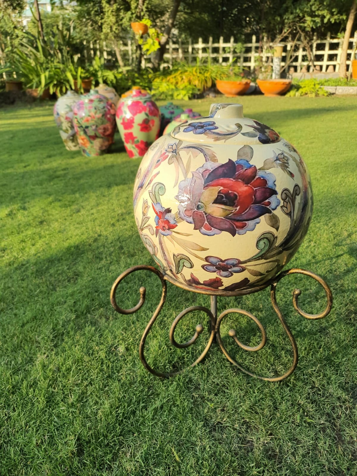 Introducing Regal Bloom Medallion, a handcrafted decorative urn that captures the essence of old-world botanical artistry with a refined luxury finish. Designed on a soft ivory base, this spherical statement pot features intricate hand-painted detailing enhanced with premium floral decoupage in rich plum, crimson, sage, and muted blue tones.