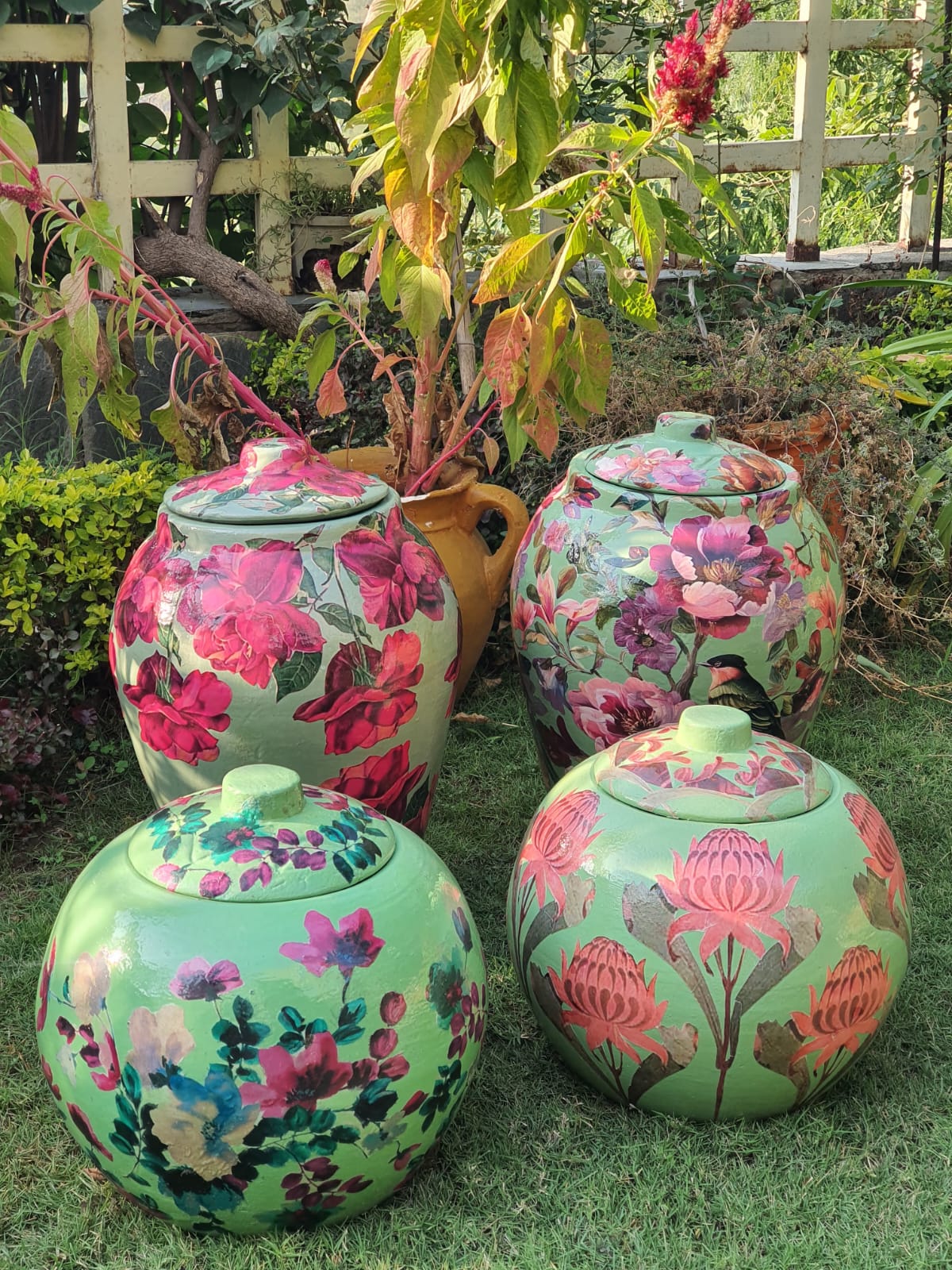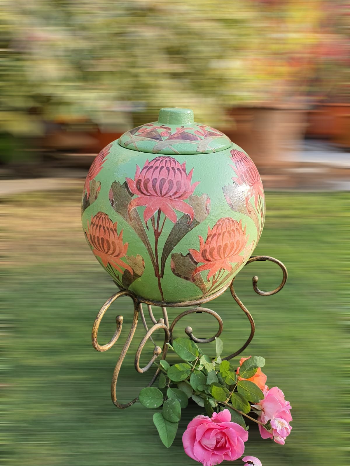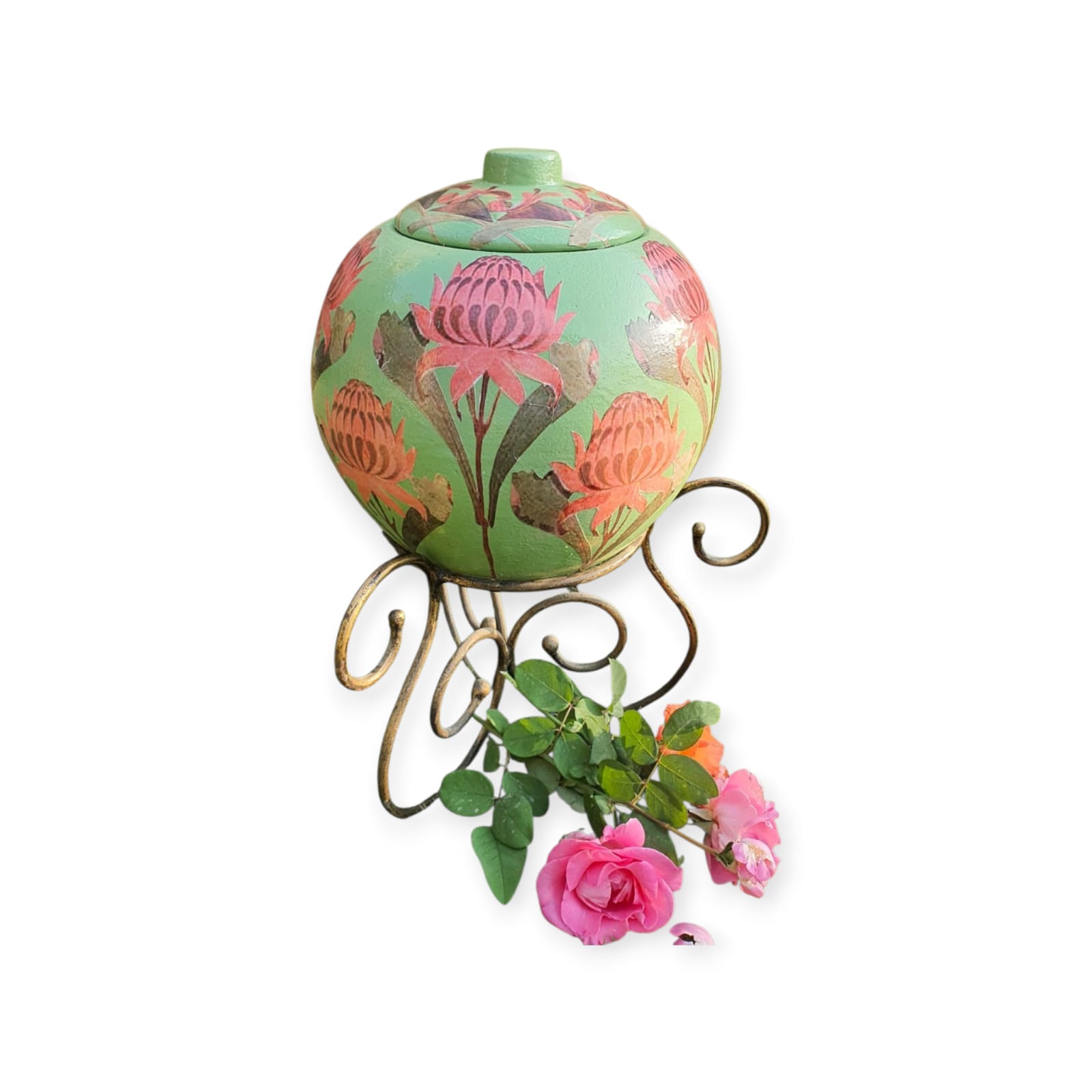 Set against a rich verdant green base, the jar features beautifully detailed lotus-inspired blooms in soft blush and earthy terracotta tones. Each motif is carefully layered using premium decoupage techniques, creating depth, texture, and a seamless artistic finish. A protective seal ensures durability, color vibrancy, and long-lasting beauty, making it ideal for both indoor décor and covered outdoor spaces.