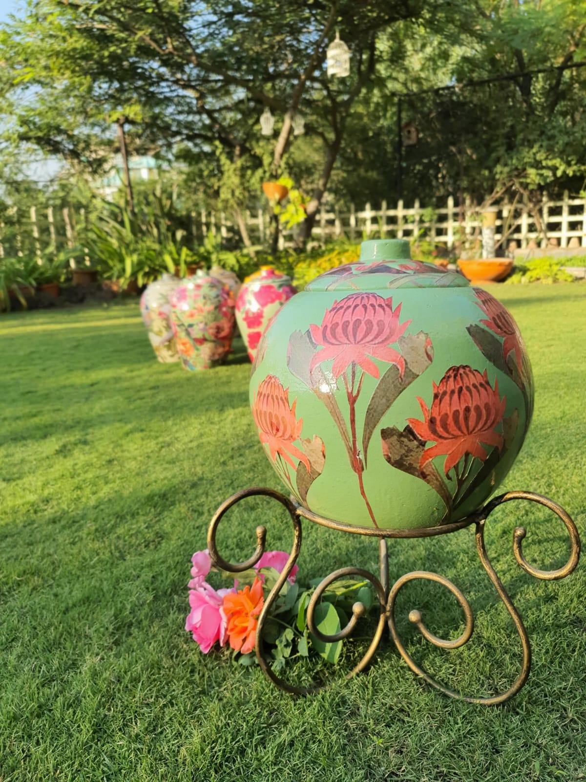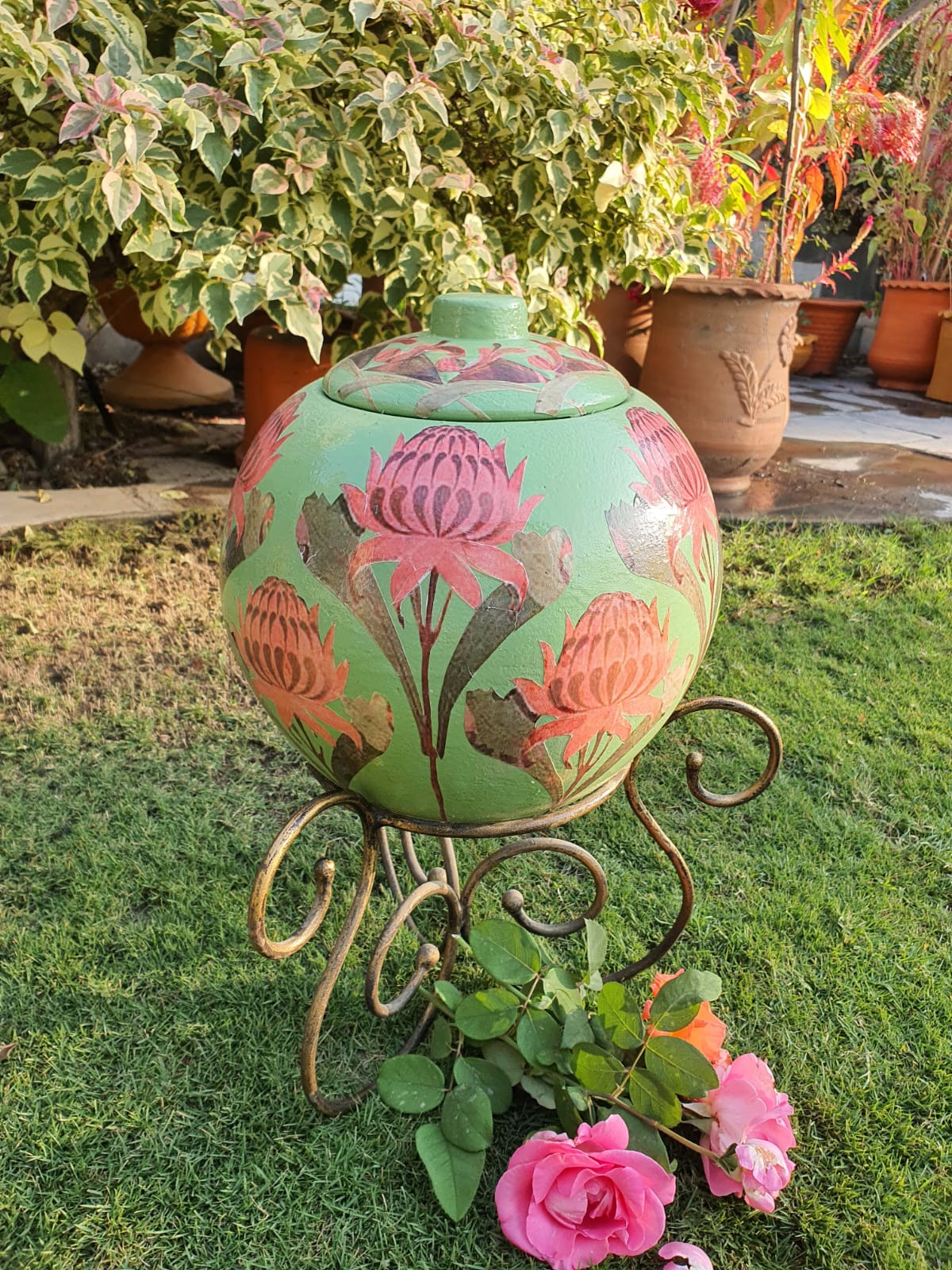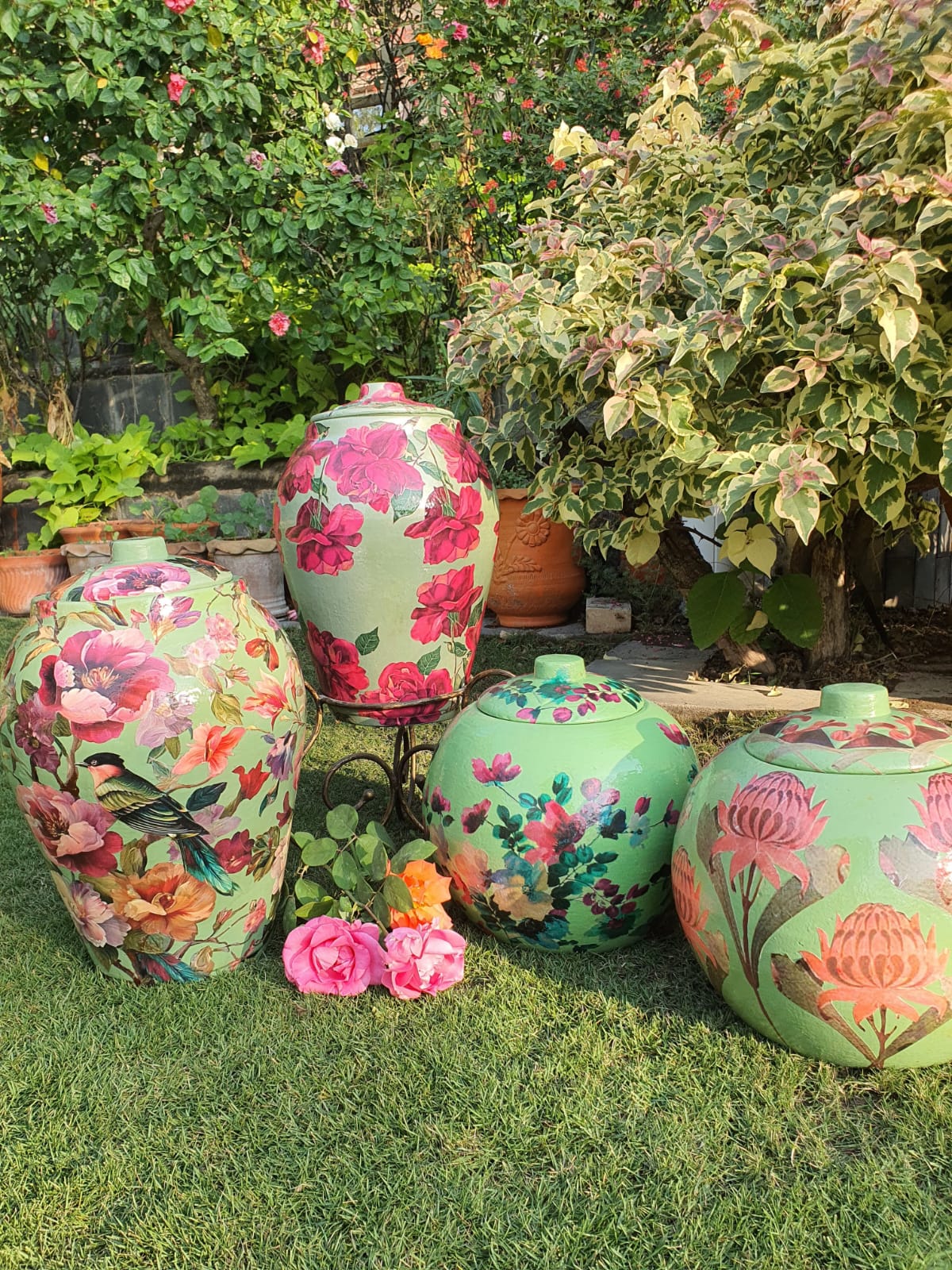 Set against a rich verdant green base, the jar features beautifully detailed lotus-inspired blooms in soft blush and earthy terracotta tones. Each motif is carefully layered using premium decoupage techniques, creating depth, texture, and a seamless artistic finish. A protective seal ensures durability, color vibrancy, and long-lasting beauty, making it ideal for both indoor décor and covered outdoor spaces.