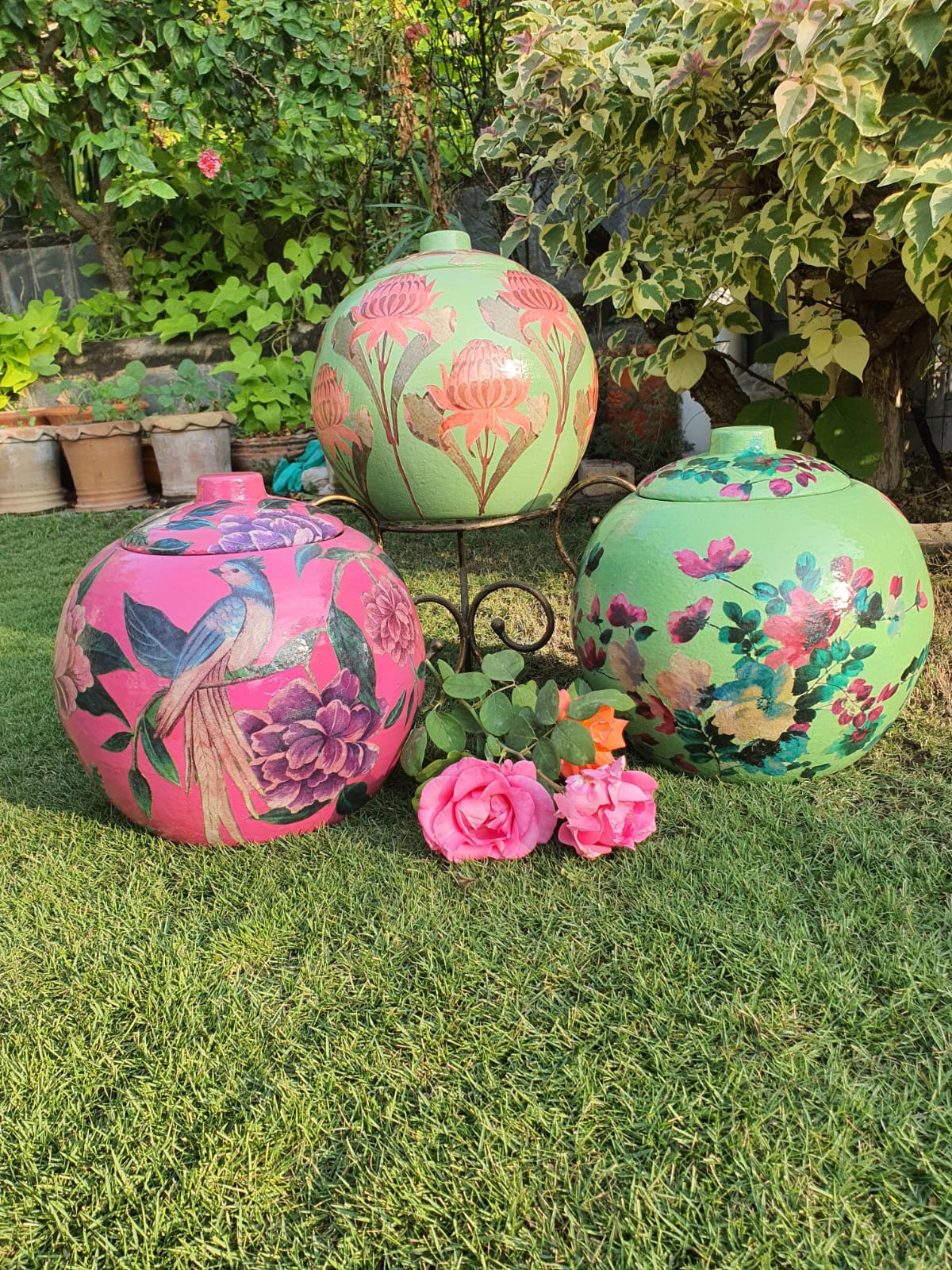 Each piece is meticulously hand-painted and layered with premium decoupage artistry, then carefully sealed for durability and long-lasting vibrancy. The lush botanical design evokes vintage European garden charm while maintaining a refined, contemporary appeal, making it a versatile accent for sophisticated interiors and curated outdoor spaces.