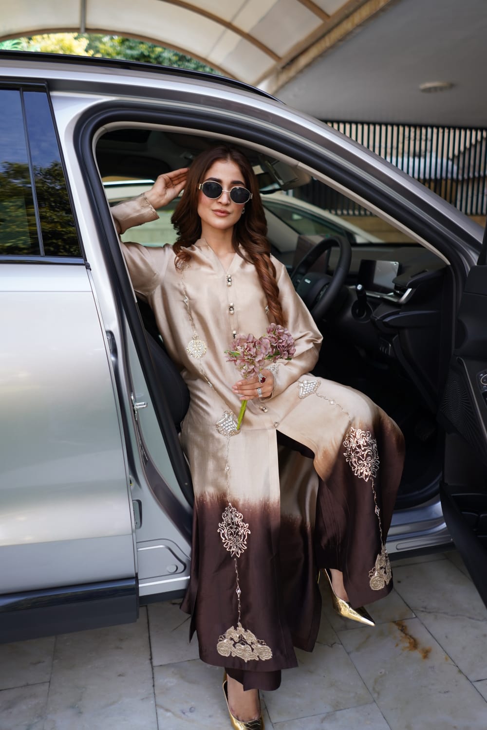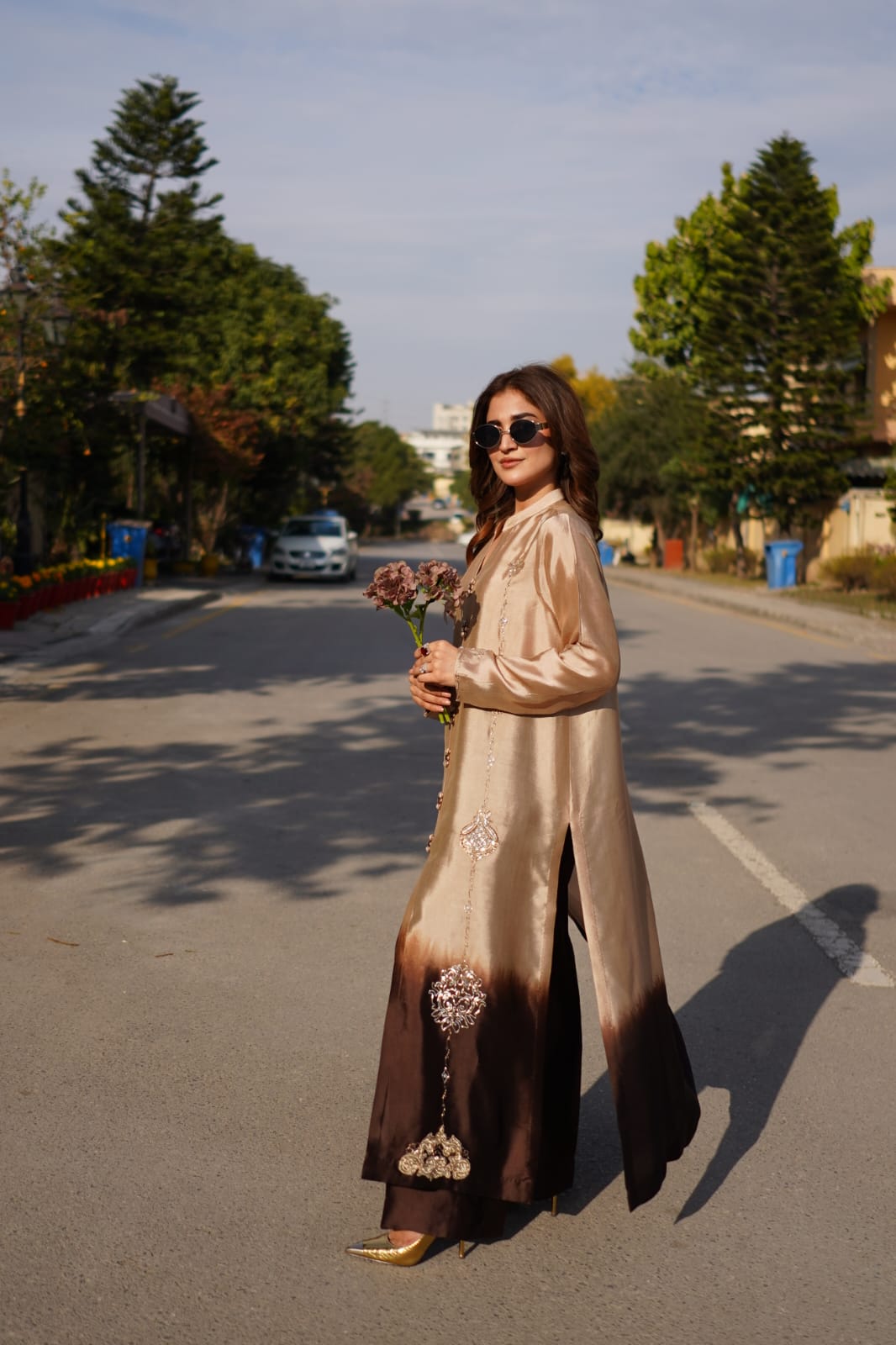 The long, fluid kurta paired with coordinated trousers creates a sophisticated and contemporary aesthetic, perfect for Eid celebrations, formal dinners, festive gatherings, weddings, and luxury evening events. The minimal yet impactful design allows the rich silk fabric and ombré tones to take center stage, embodying understated glamour.